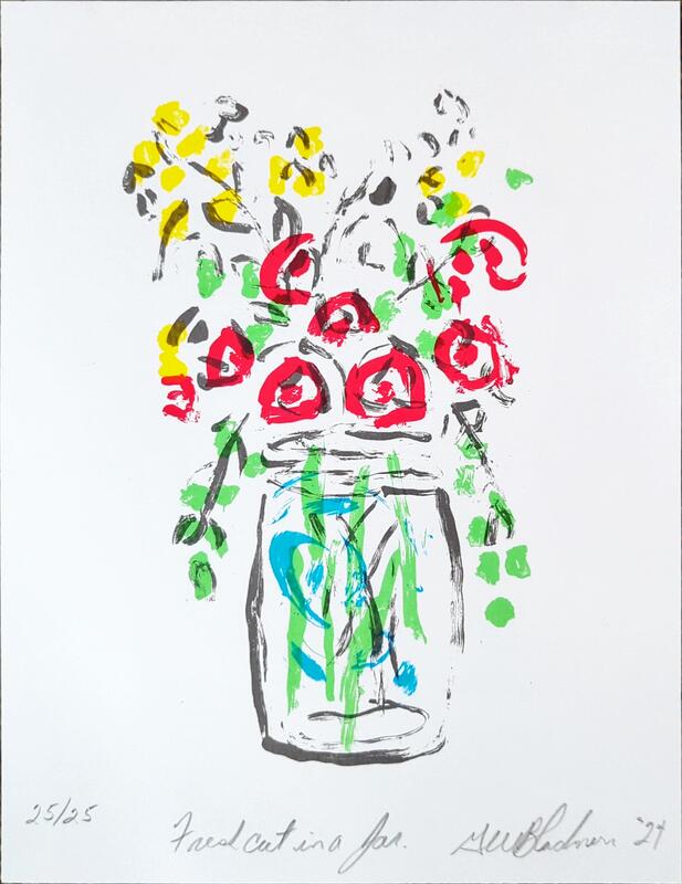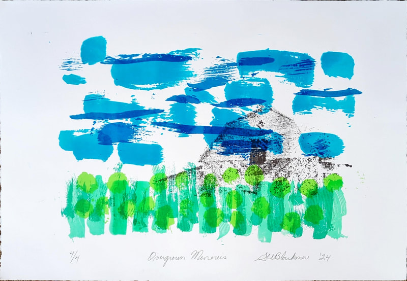 The printmaking process through the matrix, inking, presswork, and printmaking machines appeals to his character. Printmaking techniques used by Blackmore include intaglio, relief, silkscreen, stone lithography and letterpress. Gordon has been fascinated with printmaking, from high school mimeograph, to laser and inkjet party invites and business communication.